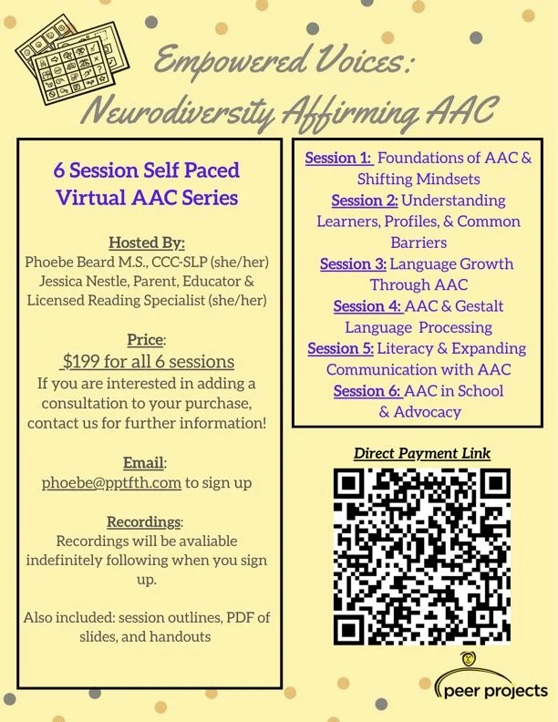 Alternative and Augmentative Communication (AAC) means all the ways an individual communicates using a different modality than verbal speech. At Peer Projects, we prioritize the value of communication for all style learners. It is crucial that all children with communication differences be provided with individualized care that supports their learning styles in an environment that affirms and progresses their language. We specialize in working with and supporting learners who use a variety of AAC modalities such as high tech speech generating devices, as well as low tech AAC such as sign language and gesturing. If your learner is new to AAC or a current AAC user, we will ensure to support them in an affirming manner that keeps their needs at the center. We know that beginning the use of an AAC device can be daunting. We strive to support learners and their families through every step, from device selection to programming to on-going learning, and meet you where you are at in order to excitedly and effectively integrate AAC into your learners and family life.